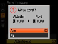 | Důležité Přeruší-li se během aktualizace napájení nebo jsou-li během aktualizace aktivovány ovládací prvky, může se fotoaparát poškodit. Během aktualizace fotoaparát nevypínejte, nevyjímejte nebo neodpojujte zdroj energie, ani nemanipulujte s ovládacími prvky fotoaparátu. Nedokončí-li se aktualizace úspěšně a fotoaparát se stane nefunkčním, předejte jej autorizovanému servisnímu zástupci firmy Nikon ke kontrole. |