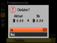 | Vigtigt Kameraet kan ødelægges, hvis strømmen afbrydes eller kameraets kontrolanordning betjenes, under opdateringen. Sluk ikke for kameraet, fjern eller afbryd ikke strømforsyningen eller betjen ikke kameraets kontrolanordning, under opdateringen. Hvis opdateringen ikke lykkedes fuldstændingt og kameraet bliver ubrugelig, tag kameraet til inspektion hos en Nikon-autoriseret servicerepræsentent. |