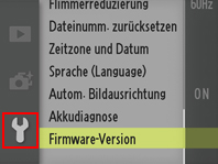 Beachten Sie, dass abhängig vom Kameramodell die während der Aktualisierung angezeigten Dialoge und Meldungen von den hier abgebildeten abweichen können. Achten Sie darauf, dass vor der Aktualisierung der Firmware eines Zubehörteils, wie etwa eines Objektivs, Bajonettadapters oder eines Blitzgeräts, das Zubehörteil an der Kamera angebracht ist, bevor Sie fortfahren. |