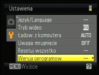 | Ważne Aparat może zostać uszkodzony, jeśli podczas aktualizacji zostanie przerwane zasilanie lub będą użyte elementy sterowania aparatu. Podczas aktualizacji nie należy wyłączać aparatu, wyjmować lub odłączać źródła zasilania lub używać elementów sterowania aparatu. Jeśli aktualizacja nie zostanie pomyślnie zakończona i nie będzie można używać aparatu, należy sprawdzić aparat w autoryzowanym serwisie firmy Nikon. |