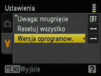| 4 | Menu Ustawienia zostanie wyświetlone na wyświetlaczu aparatu fotograficznego. Wybierz kategorię Wersja oprogramow. |