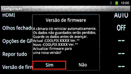 É apresentado um diálogo de actualização de firmware. Prima Sim para iniciar a actualização. |