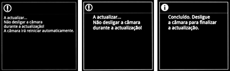 | As mensagens mostradas abaixo serão apresentadas e a câmara reiniciará durante a actualização. A actualização está completa quando a câmara apresentar a mensagem mostrada abaixo à direita. |
