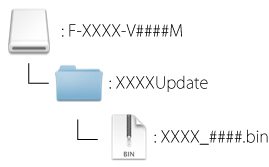 2 Na ploše se objeví jednotka fotoaparátu. Zkopírujte soubor „.bin” ze složky „update” na tuto jednotku. Po dokončení kopírování ověřte, že jednotka fotoaparátu obsahuje soubor „.bin”.