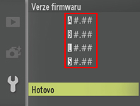 Fotoaparát zobrazí aktuální verzi firmwaru těla fotoaparátu (A/B) a libovolného nasazeného objektivu či adaptéru bajonetu (L) nebo blesku (S). Ověřte, jestli je verze firmwaru správná pro tuto aktualizaci.