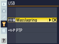 | 10 | Om du ändrade inställningen USB från PTP till Masslagring vid uppdateringen av kamerans interna programvara, öppnar du menyn USB och väljer PTP. | ||||||||||||||||
