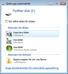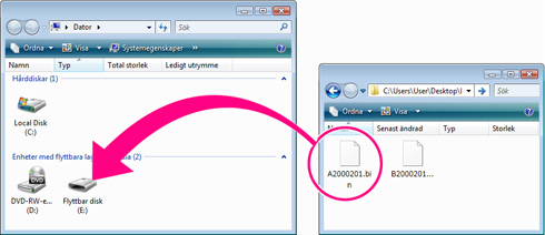 | 2 | Minneskortet visas under “Dator” (Windows Vista) eller “Den här datorn” (Windows XP) som en flyttbar disk. Kopiera firmware-versionen till den flyttbara disken på det sätt som beskrivs i steg 5 under Direkt USB-anslutning. | ||||||