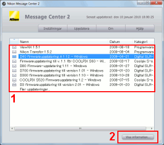 I fönstret Nikon Message Center 2 visas en lista med erhållen uppdateringsinformation i informationsområdet.