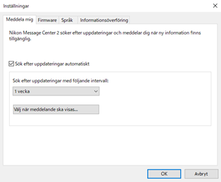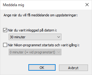 Om detta är markerat visas meddelandefönstret om det finns ny uppdateringsinformation när Nikon-programvaran startas eller efter en angiven tid.