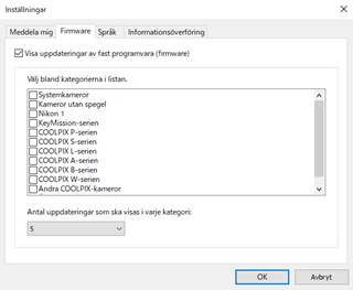 När detta är markerat söker Nikon Message Center 2 efter uppdateringar av firmware för Nikon digitalkamera eller andra Nikon-produkter. Visar även uppdateringar för firmware i informationsområdet. Det går att ställa in antalet och kategorin (typer av Nikon-produkter) av firmware som ska visas.