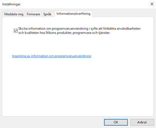 - Det finns ett avsnitt i inställningarna i Nikon Message Center 2 med rubriken "Informationsöverföring" där du kan markera kryssrutan "Skicka information om programvaruanvändning i syfte att förbättra användbarheten och kvaliteten hos Nikons produkter, programvara och tjänster".