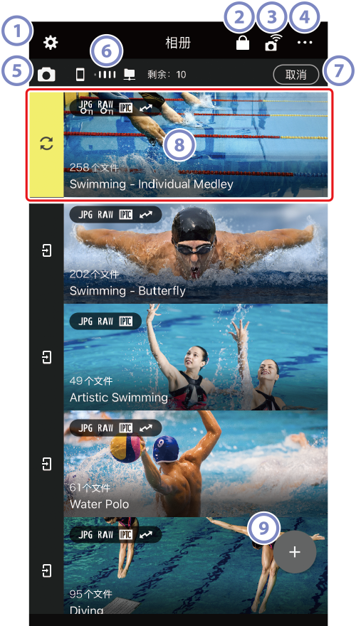 (相册选择按钮):轻触按钮选择相应的相册作为导入照片的目标位置。所选相册将移至列表顶部。在导入过程中不能使用选择按钮。