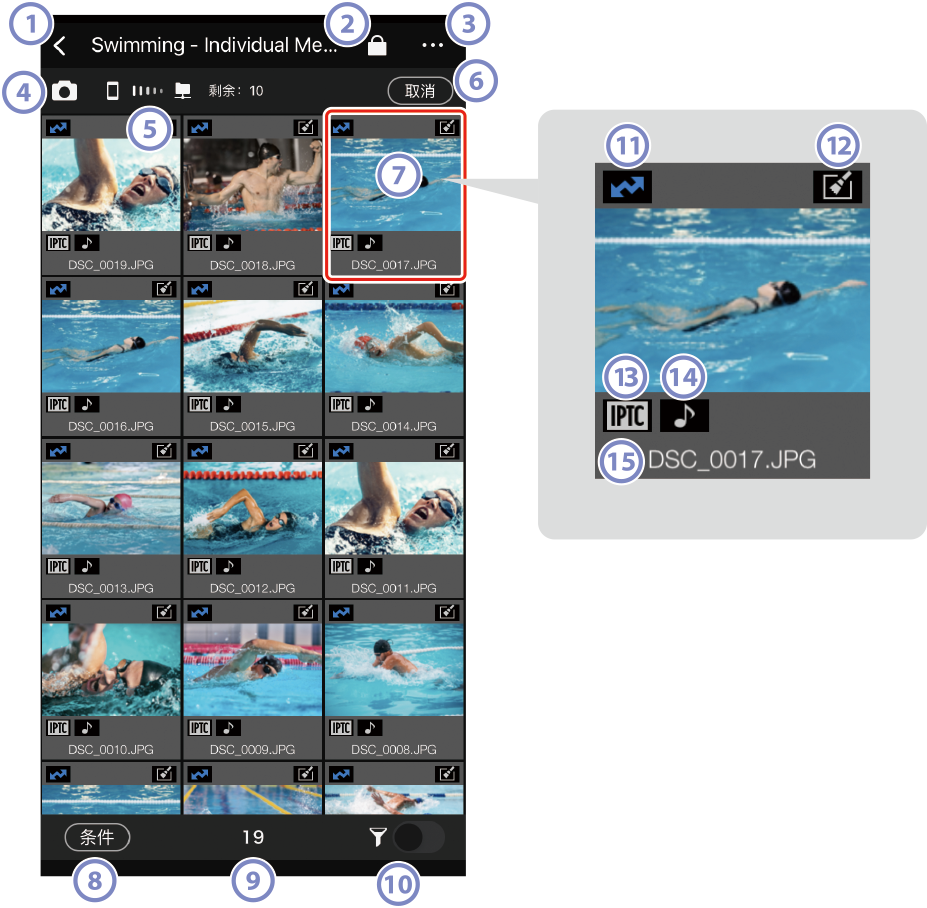 - 相册中的照片数量。若启用了筛选,则显示相册中满足当前筛选条件的照片数量。