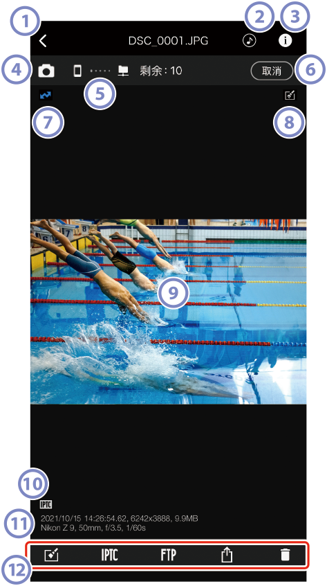 - 轻触以查看或隐藏拍摄数据,包括图像尺寸以及拍摄日期和时间。