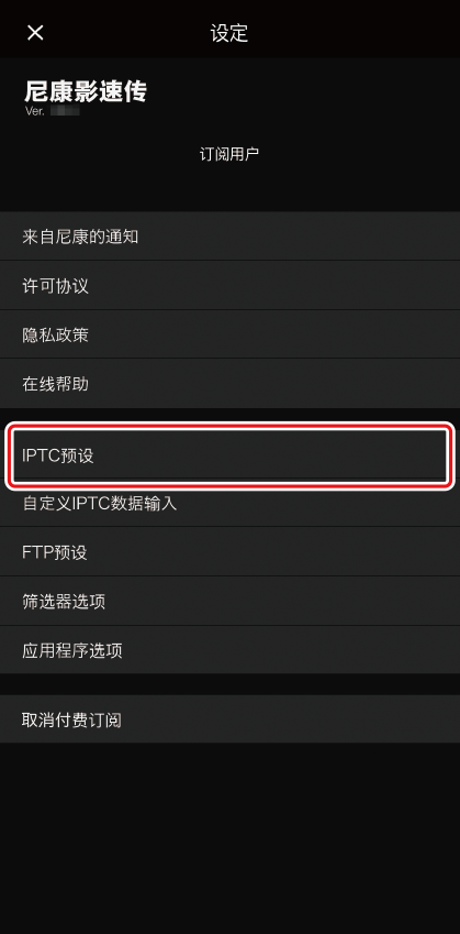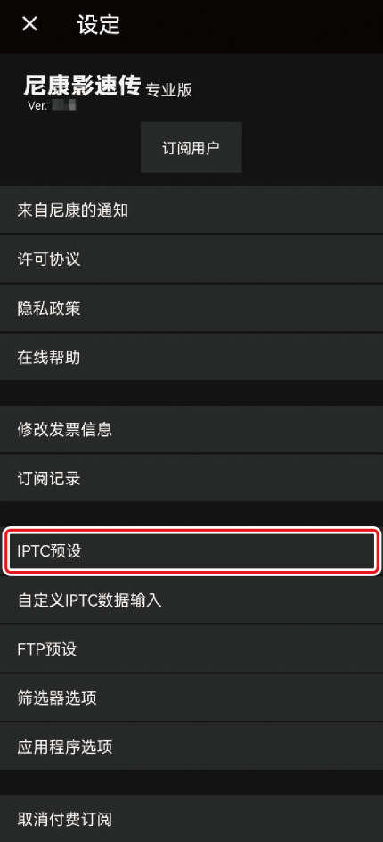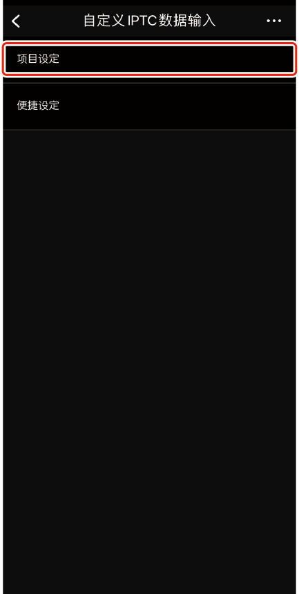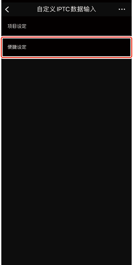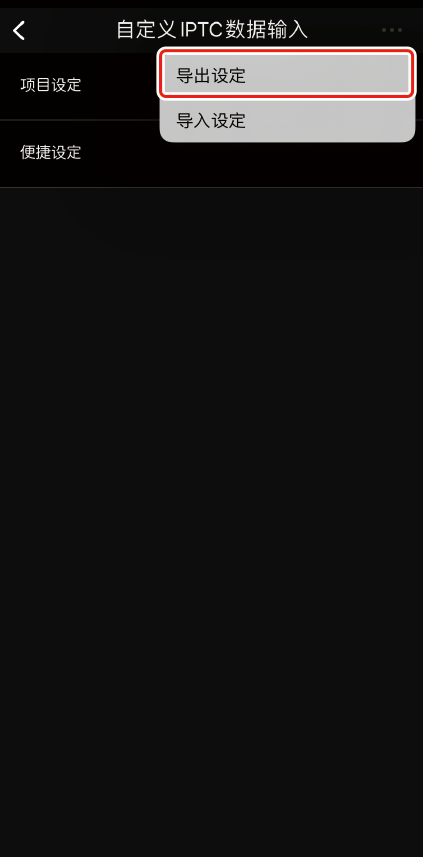 (菜单)按钮,选择[导入设定]以显示智能设备上的文件夹选择屏幕。轻触您要导入的文件以覆写自定义IPTC设定。