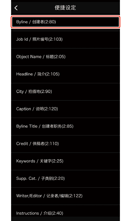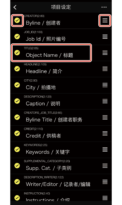 复选框来显示或隐藏字段。 - 可以轻触相关字段输入新的字段名称,但是每个字段上面显示的IPTC标记号无法更改。
