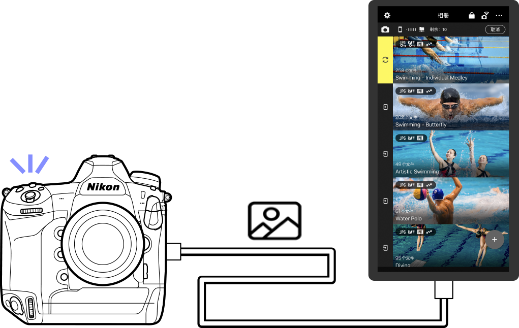 通过将照相机连接至智能设备并在出现提示时轻触[确定],或通过在两台设备相连时拍摄照片,可以将照片自动导入尼康影速传的相册中。