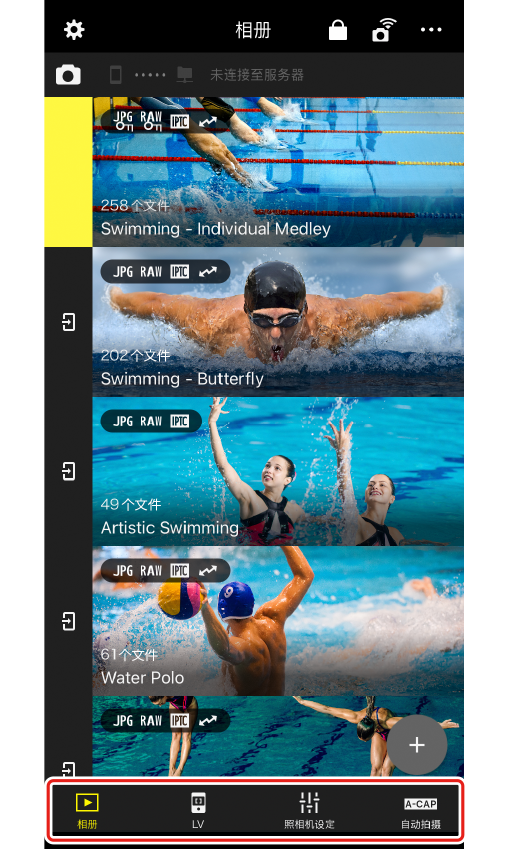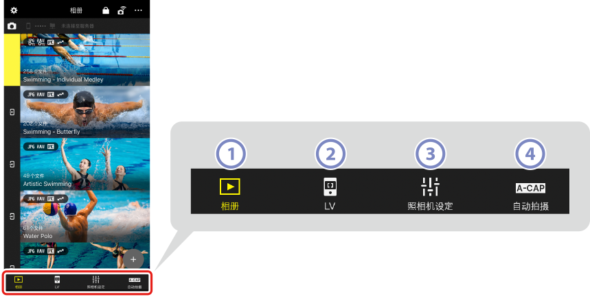 - 轻触可打开自动拍摄操作显示。可以通过尼康影速传开始、暂停自动拍摄或调整自动拍摄的设定(0在尼康影速传上执行自动拍摄操作(仅支持的照相机))。