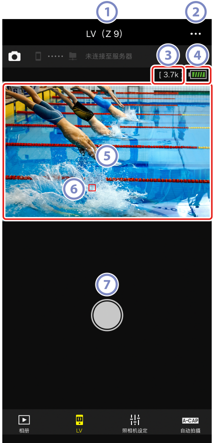 在相册列表菜单中启用遥控拍摄并轻触遥控操作标签中的[LV]可显示该屏幕(0启用遥控拍摄)。