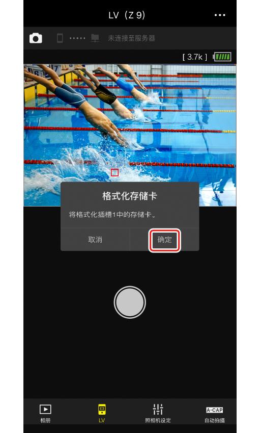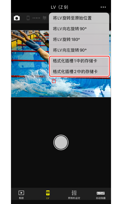 可以从尼康影速传的LV菜单将插槽1(或主插槽)或插槽2(或第二插槽)的存储卡格式化。