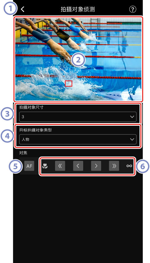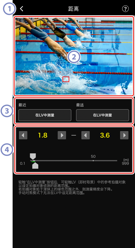- 显示已配置的与拍摄对象之间的最近和最远距离。轻触以显示距离设定(0[拍摄条件]:[距离])。