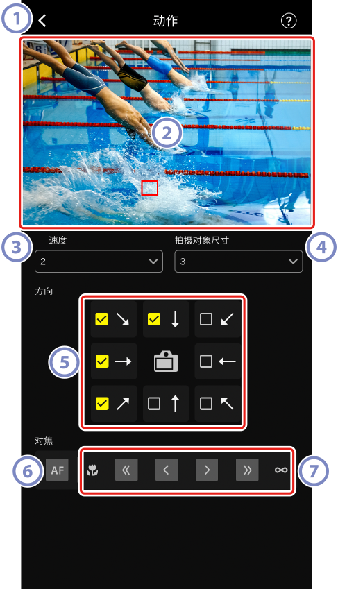 - 选择拍摄对象移动的方向以便照相机进行拍摄。可选择多个方向。
