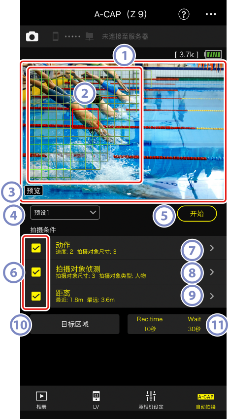 在相册列表菜单中启用遥控拍摄并轻触遥控操作标签中的[自动拍摄]可显示该屏幕(0启用遥控拍摄)。可以配置自动拍摄设定、查看预览、载入用户预设以及开始或中止自动拍摄。
