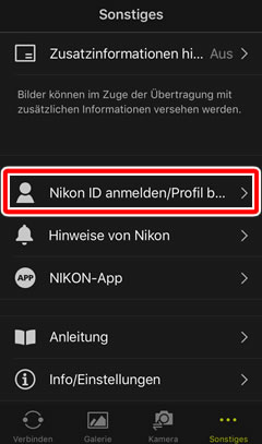 Tippen Sie auf Nikon ID anmelden/Profil bearbeiten in der Registerkarte Sonstiges, um sich für eine Nikon ID anzumelden. Mit der Anmeldung für eine Nikon ID wird die Kamera, die derzeit mit dem Smartgerät verbunden ist, automatisch zur Produktregistrierungsdatenbank von Nikon hinzugefügt.