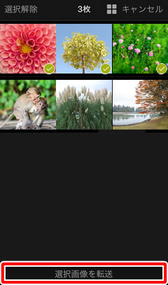 [選択]ボタンをタップし、画像選択画面で転送したい画像を全てタップします。選んだ画像には