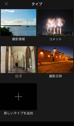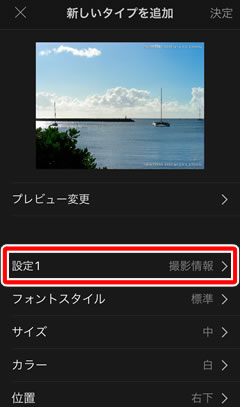 [タイプ]で画像に入れる情報の種類を選べます。設定を選び、[決定]をタップするとクレジットが追加されます。それぞれの設定画面で画像をタップすると、プレビューを表示できます。