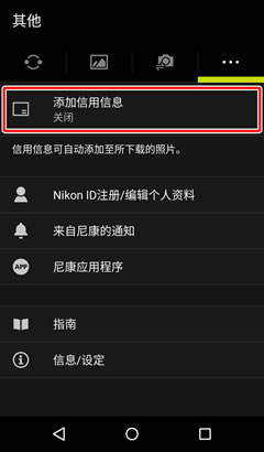其他标签中的添加信用信息选项可用于创建和编辑信用信息并在下载照片至智能设备时将这些信息加印在照片上。