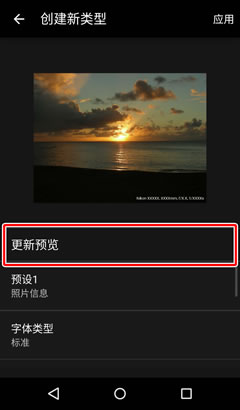 使用类型可选择添加至所下载照片的信息的类型。轻触缩略图预览效果后,选择一个选项并轻触应用;所选信用信息将在启用添加信用信息时添加至照片。