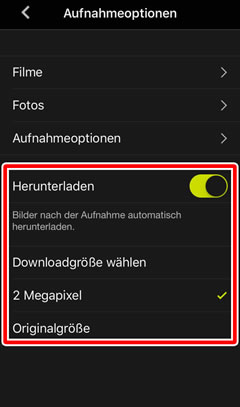 Wenn »Herunterladen« aktiviert ist, werden die Bilder, die mit der Fernauslösung aufgenommen wurden, automatisch auf das Smartgerät in einem Format heruntergeladen, das für »Downloadgröße wählen« ausgewählt wurde. Die Bilder, die mit der Fernauslösung aufgenommen wurden, sind in der Registerkarte »Galerie« unter »Alle« aufgeführt.