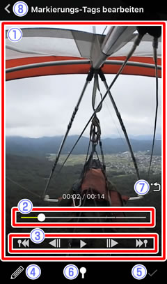 • Filmwiedergabeanzeige: Zeigen Sie den Film an, um Standorte für Markierungs-Tags zu wählen.