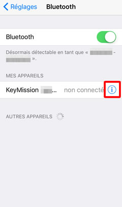 Périphérique mobile : lorsque vous êtes invité à sélectionner un accessoire, attendez que l'icône Bluetooth située en haut à droite de l'écran passe du blanc au gris, puis touchez le nom de la caméra (le nom de la caméra peut mettre un certain temps à s'afficher).