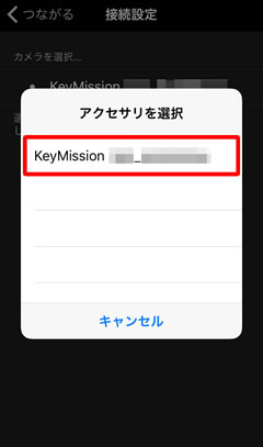 スマートフォン:アクセサリーの選択画面が表示されたときは、画面右上のBluetoothマークが白色から灰色に変わったことを確認してから、カメラ名をタップする