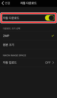 촬영되는 순간 카메라에서 사진을 다운로드하려면 연결 탭에서 자동 다운로드를 사용하도록 설정합니다.