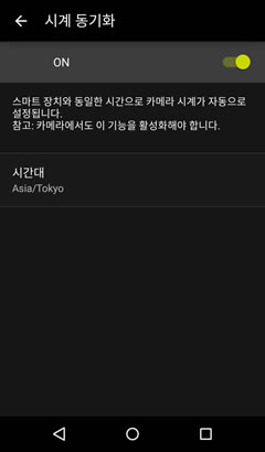 카메라 시계와 스마트 장치를 동기화하려면 연결 탭의 시계 동기화를 사용하도록 설정합니다.