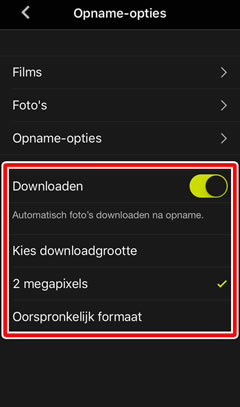 Als Downloaden ingeschakeld is, worden foto’s, gemaakt met behulp van afstand bediende fotografie, automatisch naar het smartapparaat gedownload op het formaat geselecteerd voor Kies downloadgrootte. Foto’s gemaakt met behulp van afstand bediende fotografie worden vermeld in het tabblad Galerij onder Foto’s op apparaat.