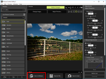 - Select the custom Picture Control to export, and click [Use in Software] on the [Share] palette.