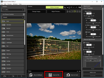- Select the custom Picture Control to export, and click [Save to File] on the [Share] palette.