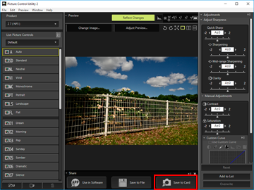 - Select a custom Picture Control to export, and click [Save to Card] on the [Share] palette.