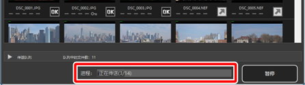 [进程] 栏中以所下载的照片数量对比队列中文件总数的形式显示当前下载状态。若要暂停下载,请单击 [暂停]。