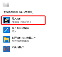 此时,请单击该对话框,然后单击 [导入文件//Nikon Transfer 2] 以选择Nikon Transfer 2。下次当计算机侦测到照相机或其存储卡时,Nikon Transfer 2将自动启动。