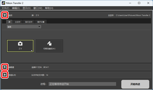 - 使用 [源] 和 [主目标] 选项卡选择将从中下载照片的设备和计算机上用于存储所下载照片的文件夹。使用 [备份目标] 选项卡可设定在下载过程中创建备份,使用 [偏好设置] 选项卡可调整下载设定(0 [选项] 面板)。