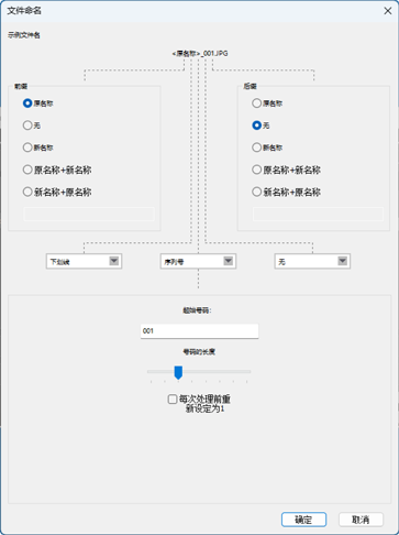 - 对话框顶部的 [示例文件名] 栏中会显示按所选规则生成的名称示例。当您编辑规则时,该示例会自动更新。