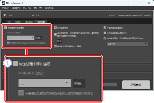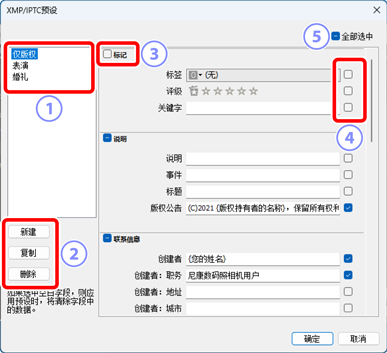 - [XMP/IPTC预设]:从下拉菜单中选择一个已保存的预设。若要管理XMP/IPTC预设,请单击 [编辑](0 XMP/IPTC预设)。