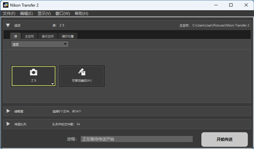 您可执行各种任务,包括选择源设备(将从中下载照片的设备)和选择目标文件夹。[选项] 面板包含以下选项卡:[源]、[主目标]、[备份目标] 和 [偏好设置]。