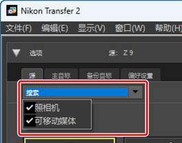 使用 [搜索] 下拉菜单从 [照相机] 和 [可移动媒体] 中选择 [源] 选项卡中显示的设备类型。该选项卡仅将列出所选类型的设备的按钮。