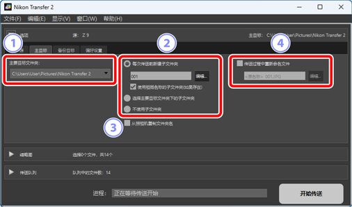 - [选择主要目标文件夹下的子文件夹]:下载照片至为 [主要目标文件夹] 所选的文件夹中的子文件夹。请在传送选项区域上方的 [主目标] 路径的末尾处输入子文件夹的名称。若并不存在所选子文件夹,则会在所选名称下新建一个子文件夹。您也可以从下拉菜单中选择一个之前使用过的子文件夹。